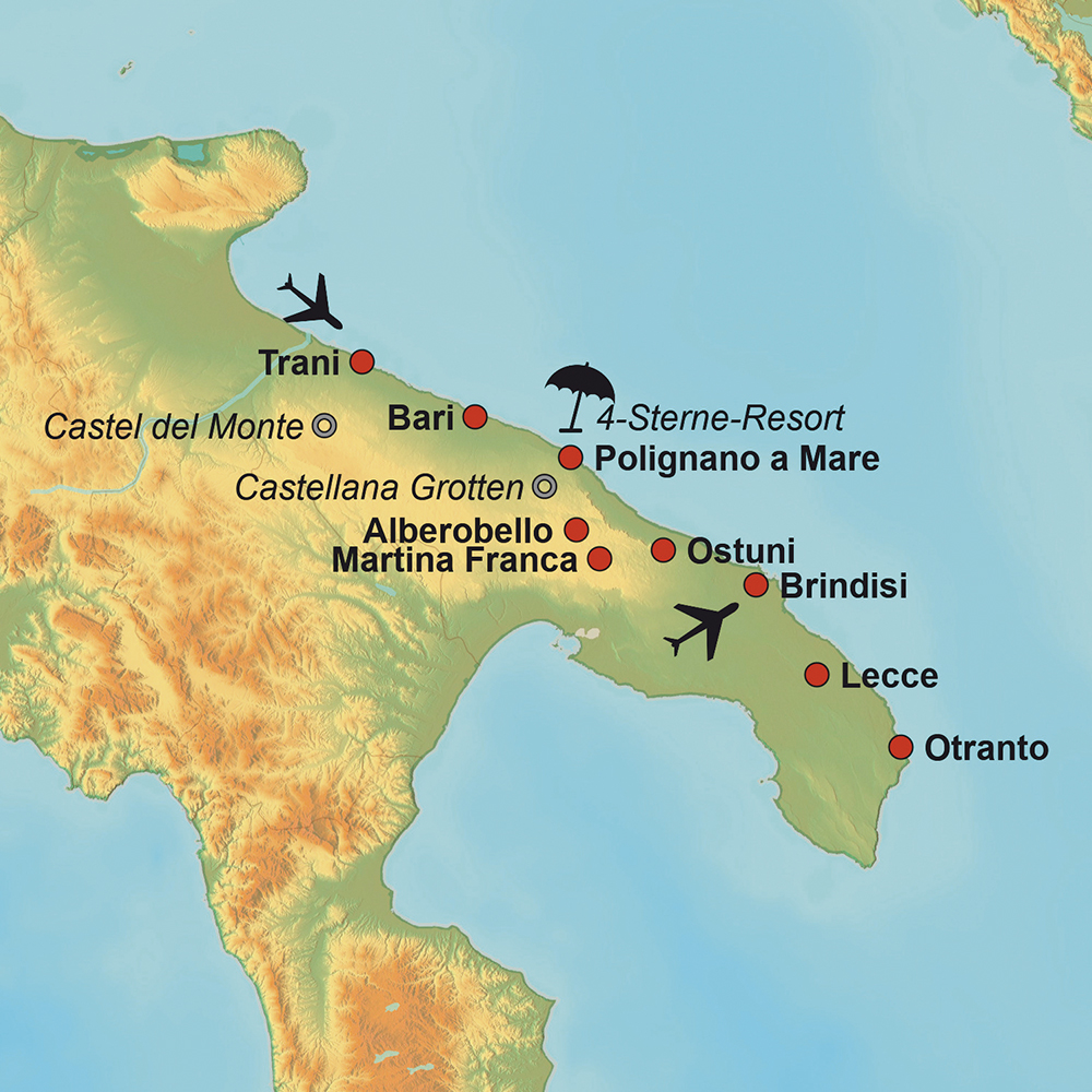 • Hin- und Rückflug mit renommierter Fluggesellschaft (Via-Flüge möglich), Deutschland nach Bari oder Brindisi