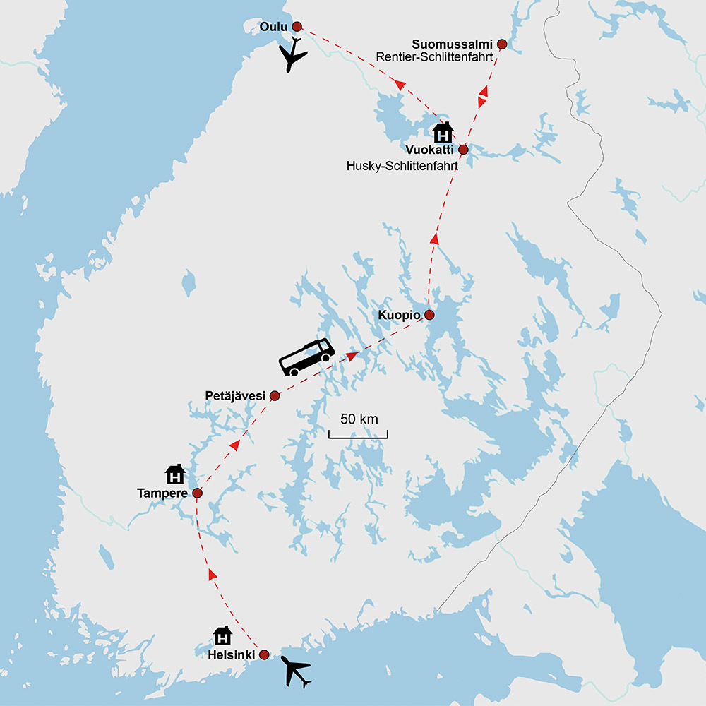 • NEU: Entspannte Rückreise aus dem „arktischen Seenland“ per Flug von Oulu via Helsinki nach Deutschland