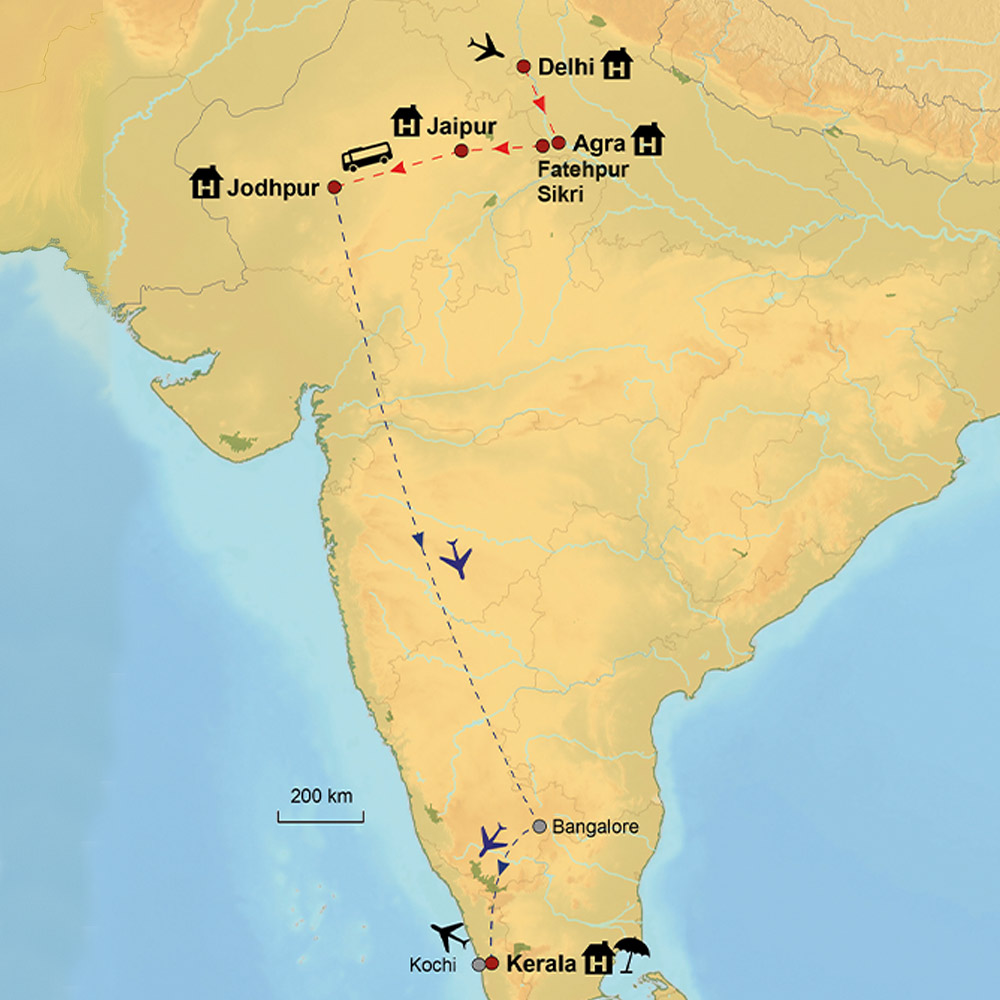 Unsere neue Entdeckerreise führt Sie nach Indien entlang des Goldenen Dreiecks – Delhi, Agra und Jaipur –, weiter bis nach Jodhpur und endet im grünen Süden in Kerala. Erleben Sie mit uns dieses facettenreiche Land – sicher, organisiert und in einer angenehmen Gruppengröße mit maximal 26 Gästen.