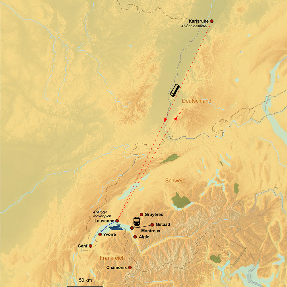 Nach dem Frühstück machen wir es uns im Reisebus bequem und lassen die Eindrücke  der Stadt nachwirken. Die Reise führt uns weiter gen Süden. In der Schweiz verändert sich die Landschaft: sanfte Hügel und idyllische Dörfer begleiten uns auf dem Weg nach  Lausanne, wo wir erstmals den Genfersee erblicken. Dort unternehmen wir eine Stadtrundfahrt in unserem Bus. Mit fachkundigen Erläuterungen und unterhaltsamen Anekdoten gibt unsere Reiseleitung einen lebendigen Überblick über die Stadt, ihre Geschichte und ihre Besonderheiten – vom Blick auf die Altstadt bis zum eleganten Seeufer. Im Anschluss checken wir in unser Hotel ein – voller Vorfreude auf die kommenden Erlebnisse.