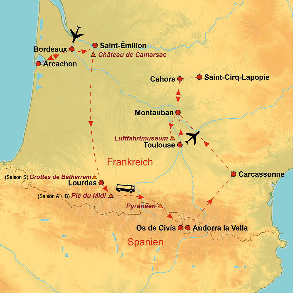 • Hin- und Rückflug mit renommierter Fluggesellschaft: (Via-Flüge möglich) Deutschland nach Bordeaux, Toulouse nach Deutschland