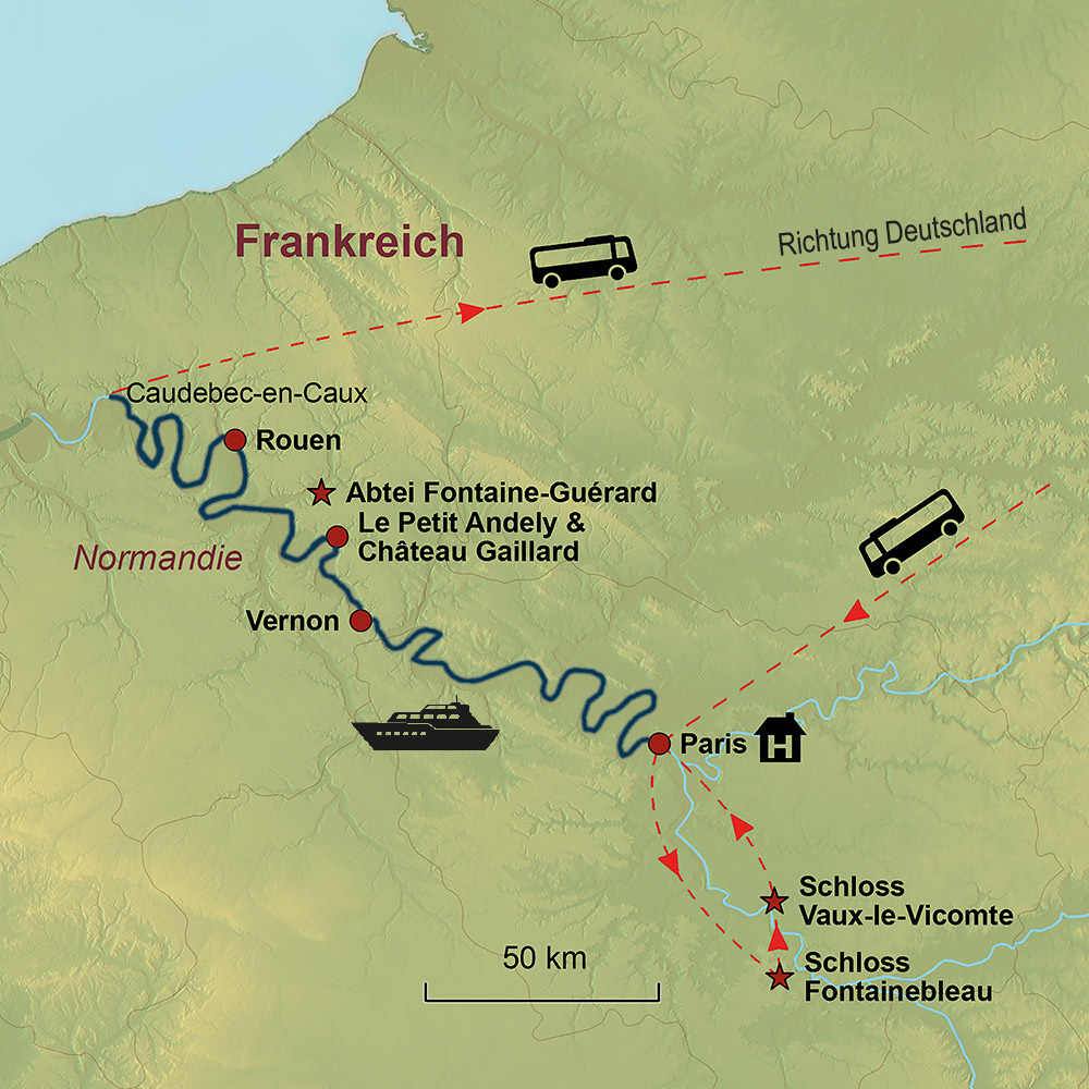 An Bord der „SEINE COMTESSE“ erleben wir eine komfortable Flusskreuzfahrt inklusive Vollpension und umfangreichen Getränkepakets. Unsere bereits enthaltenen Landausflüge führen nach Vernon, Le Petit Andely und Rouen.