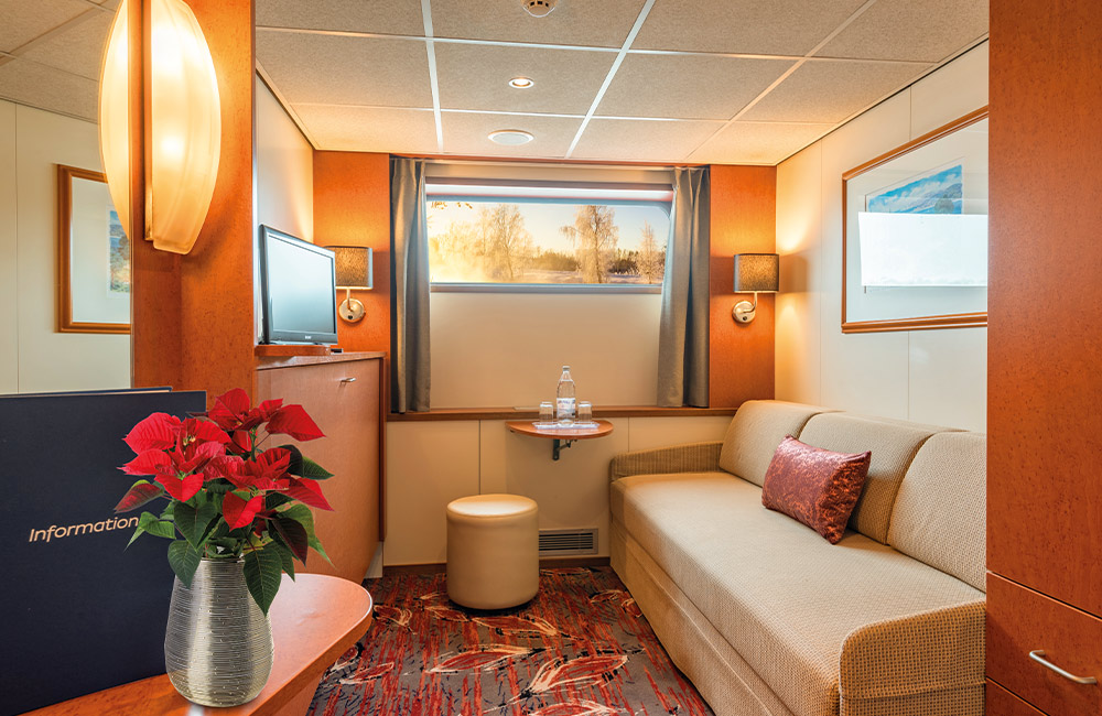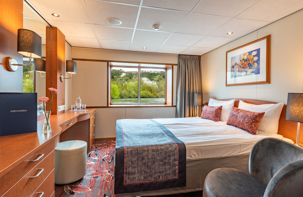 2-Bett-Außenkabine, Deluxe Mitteldeck 145 €: 14 m², großes Panorama-Schiebefenster, zur Hälfte zu öffnen