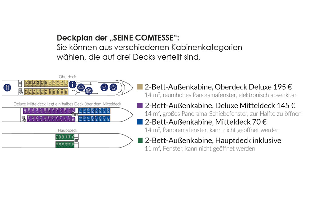 – Softdrink, Wein oder Bier zum Hauptgang, Kaffee oder Tee zum DessertAuf dem Premium-Flusskreuzfahrtschiff „SEINE COMTESSE